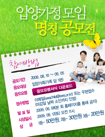 ![]() ´ëÇÑ»çȸº¹Áöȸ¿¡¼´Â º»È¸¿¡¼ ÀÔ¾çÇϽа¡Á·¸ðÀÓÀ» Ȱ¹ßÇÏ°Ô ¸¸µé¾î °¡±â À§ÇØ ÀԾ簡Á¤¸ðÀÓÀ» °á¼ºÇÏ¿´°í ÀԾ簡Á¤¸ðÀÓ ¸íĪ °ø¸ðÀüÀ» ½Ç½ÃÇÕ´Ï´Ù. ÁÁÀº ¾ÆÀ̵ð¾î°¡ ÀÖÀ¸½Å °¡Á·µéÀº ´ç÷ÀÇ Çà¿îÀ» ¾òÀ¸½Ã±â¸¦ ¹Ù¶ö²²¿ä^^ * °ø¸ð±â°£: 2009.08.10~2009.09.05. * ¹ß Ç¥ ÀÏ : 2009.09.08(º» ȸ ȨÆäÀÌÁö) * ÀÀ¸ð´ë»ó: ÀԾ簡Á· * »ó ±Ý: 1µî-50¸¸¿ø, 2µî-30¸¸¿ø, 3µî-20¸¸¿ø |