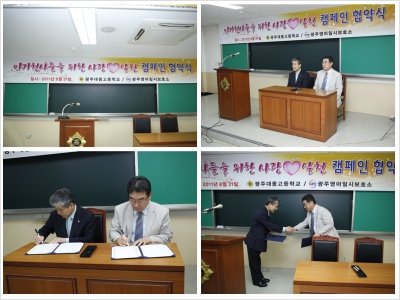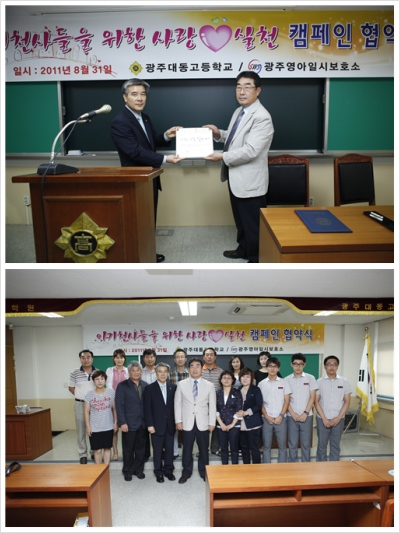 2011³â 8¿ù31ÀÏ(¼ö) º» º¸È£¼Ò´Â ±¤Áִ뵿°íµîÇб³¿Í ÇÔ²² ¾Æ±âõ»çµéÀ» À§ÇÑ »ç¶û¢¾½Çõ Ä·ÆäÀÎ Çù¾à½ÄÀ» °¡Á³½À´Ï´Ù. ±×µ¿¾È ²ÙÁØÇÏ°Ô ºÀ»çȰµ¿ ¹× ³ª´®¿îµ¿À» Àü°³ÇØ ¿Â ±¤Áִ뵿°íµîÇб³ Àü Çлýµé°ú ÇÔ²² ü°èÀûÀ̰í Áö¼ÓÀûÀΠȰµ¿À¸·Î »ç¶û°ú ³ª´®À» ½ÇõÇÏ°í ½Ã¼³¾Æµ¿µé¿¡ ´ëÇÑ ºÎÁ¤ÀûÀÎ ÀνÄÀ» °³¼±ÇϰíÀÚ »ç¶û¢¾ ½Çõ Ä·ÆäÀÎÀ» ÁøÇàÇÏ°Ô µÇ¾ú½À´Ï´Ù. ƯÈ÷ Çù¾à½Ä Âü¼®Àڷδ ±¤Áִ뵿°íµîÇб³ ±¹Çü±Ù ±³Àå¼±»ý´Ô, ±¤ÁÖ¿µ¾ÆÀϽú¸È£¼Ò ±èÀ翵 ¿øÀå´ÔÀ» ºñ·ÔÇØ °¢ ÇÐ±Þ ´ëÇ¥ ¼±»ý´Ô, °¢ ÇÐ±Þ ´ëÇ¥ ÀÓ¿ø, Çкθð ºÀ»ç´Ü ´ëÇ¥¸¦ ¸ð½Ã°í ÇÔ²² Çù¾àÀ» °¡Á³À¸¸ç 2011.8.1-2011.8.20±îÁö »ç¶ûÀÇ µ¿Àü½×±â¸¦ Àü°³ÇÏ¿© ¸¶·ÃµÈ ¼º±Ý Àü´Þ½Äµµ ÇÔ²² °¡Á³½À´Ï´Ù. ¾ÕÀ¸·Î ±¤Áִ뵿°íµîÇб³´Â Áö¿ª»çȸ¾ÈÀÇ ³ª´®À» ½ÇõÇÏ°í ´õºÒ¾î »ç´Â »çȸ¸¦ ½ÇõÇÒ ¼ö ÀÖ´Â ³ª´®ÀÇ ½ÃÀÛÀÌ Áö¼ÓÀûÀ¸·Î À̾îÁú ¿¹Á¤ÀÔ´Ï´Ù.